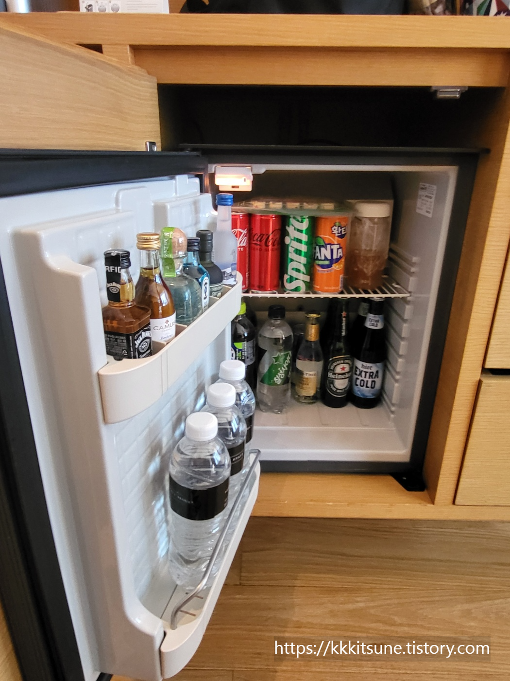 침대 옆에는 테이블이랑 미니바가 있다.