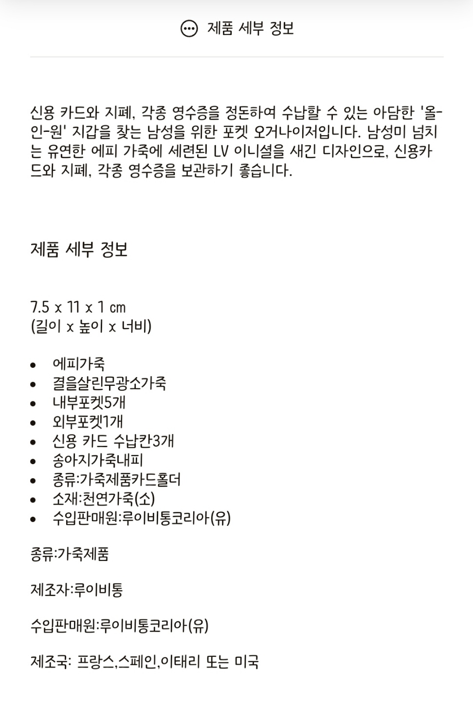 ◾루이비통 남성 카드지갑 포켓오거나이저 가격 및 소재