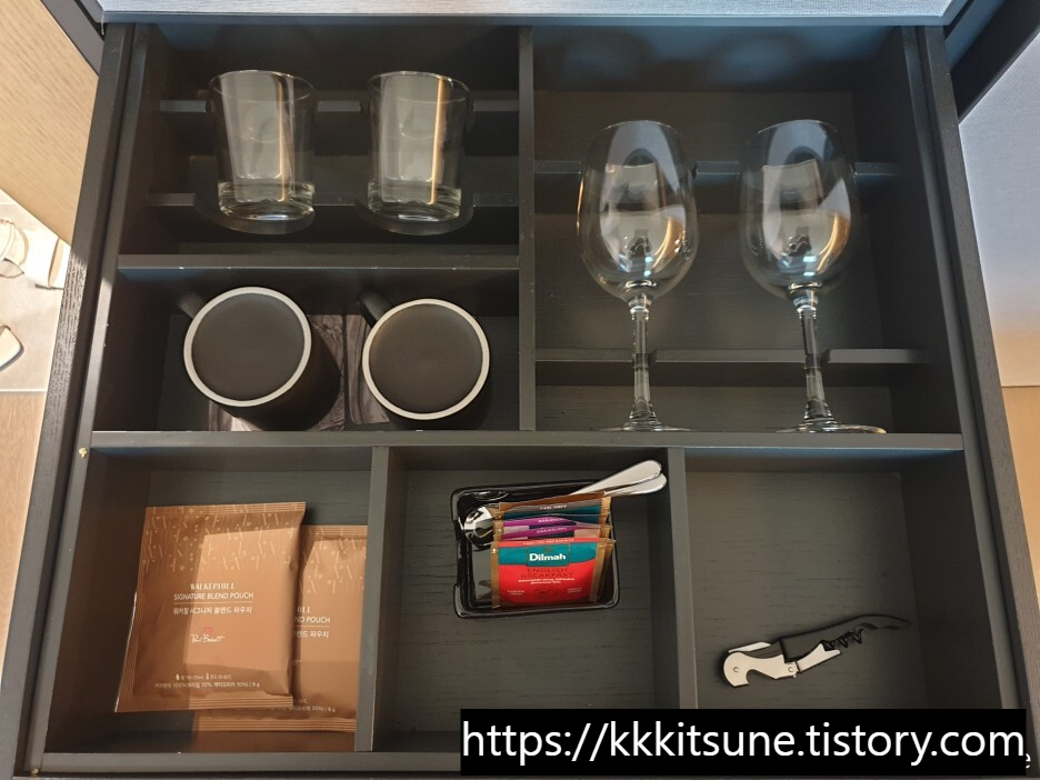 폴바셋 커피와 티, 와인오프너까지 정갈하게 있다.