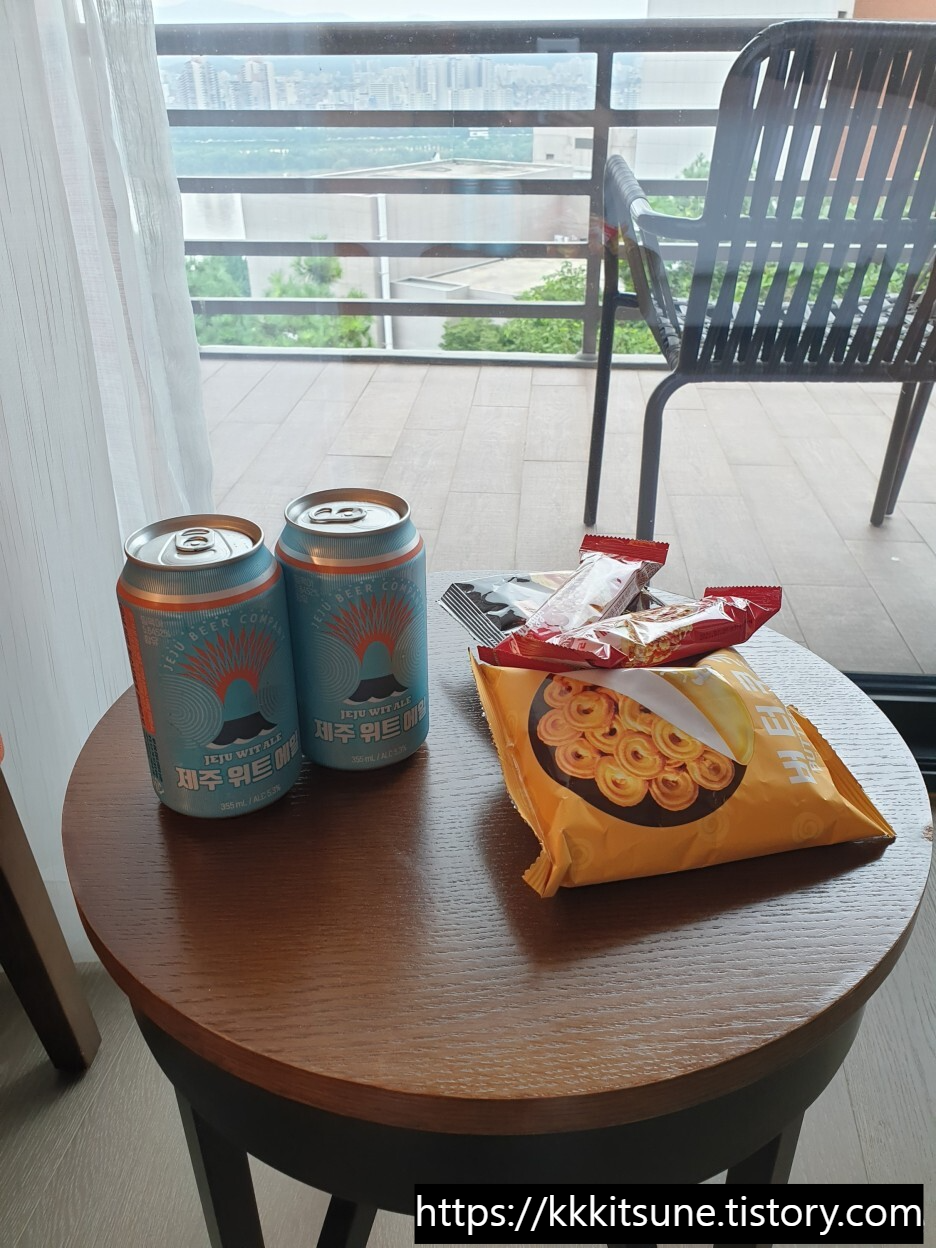 체크인 하자마자 일단 시원하게 한 캔을 때린다.