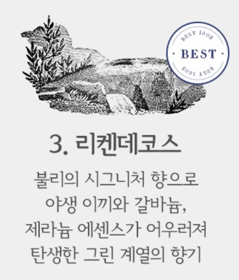 야생 이끼, 갈바늄, 제라늄 에센스가 합쳐진 향이라고.