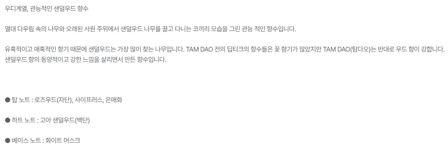 향수들은 꽃 향기가 많았지만 TAM DAO는 반대로 우드 향이