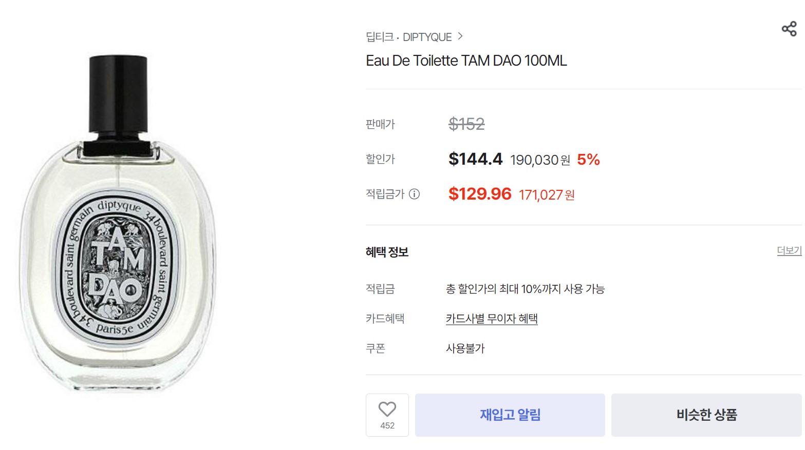 딥티크 탐다오 오드뚜왈렛 가격은 19만 원이다.